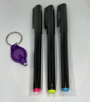 Kolme eriväristä UV-tussia (punainen, vihreä ja sininen) sekä UV-led-avaimenperä, jossa kokoonsa nähden tehokas valaisuteho (n. 1-2 metriä huoneen valaistuksesta riippuen)